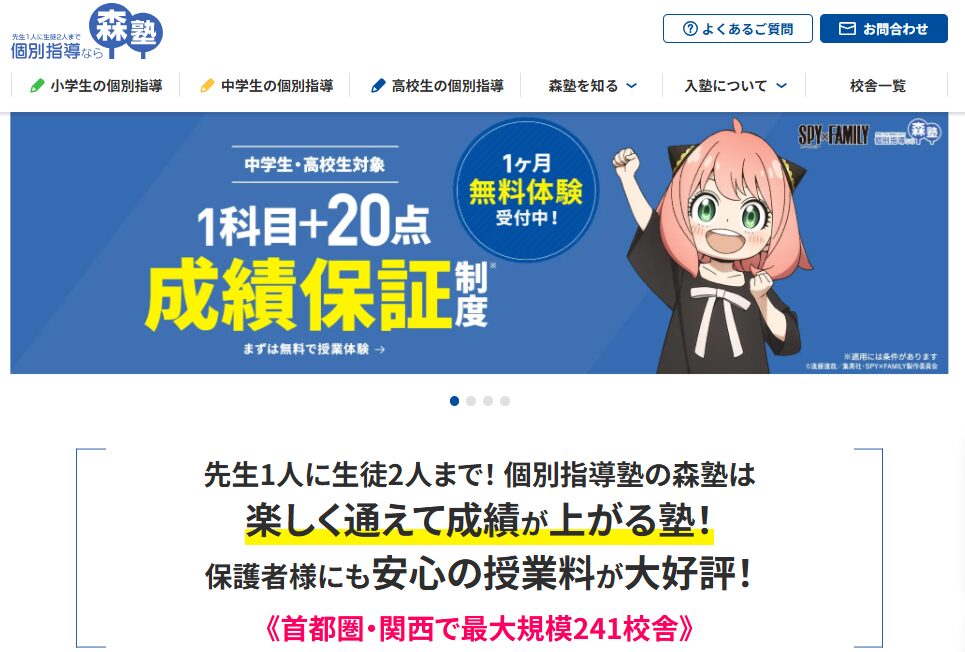 森塾には、入塾後2学期以内に成績が上がらない場合、1学期間の授業料を免除する「成績保証*制度」があります。(*諸条件あり。詳しくは森塾の公式サイトまでお問合わせください。)